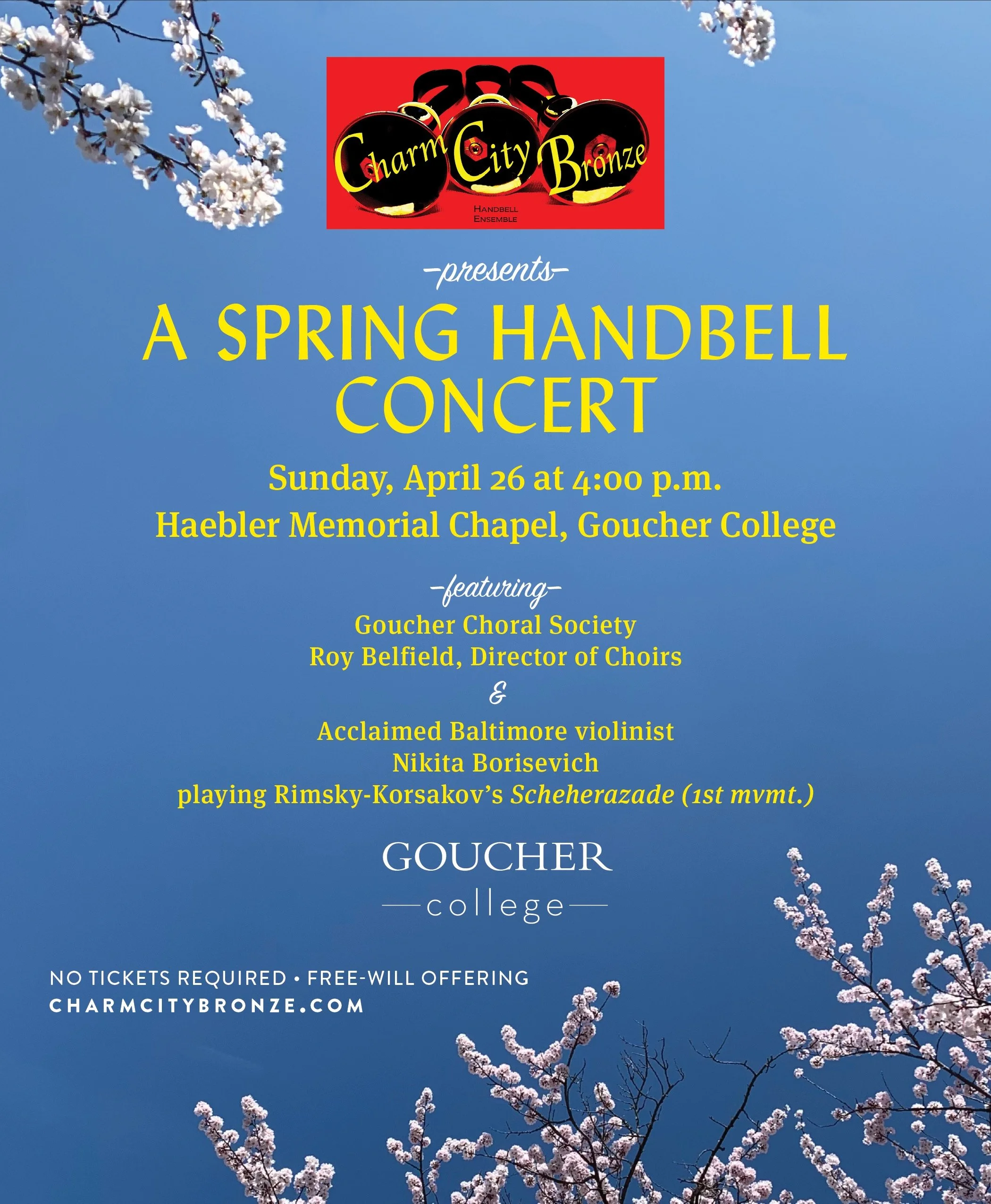 Baltimore’s premier handbell ensemble features over 5 octaves of handbells plus chimes, percussion and kazoos! Guest performers will include the Goucher Choral Society, with Roy Belfield, and violinist Nikita Borisevich. No tickets required - Free will offering. Doors open at 3:30pm.