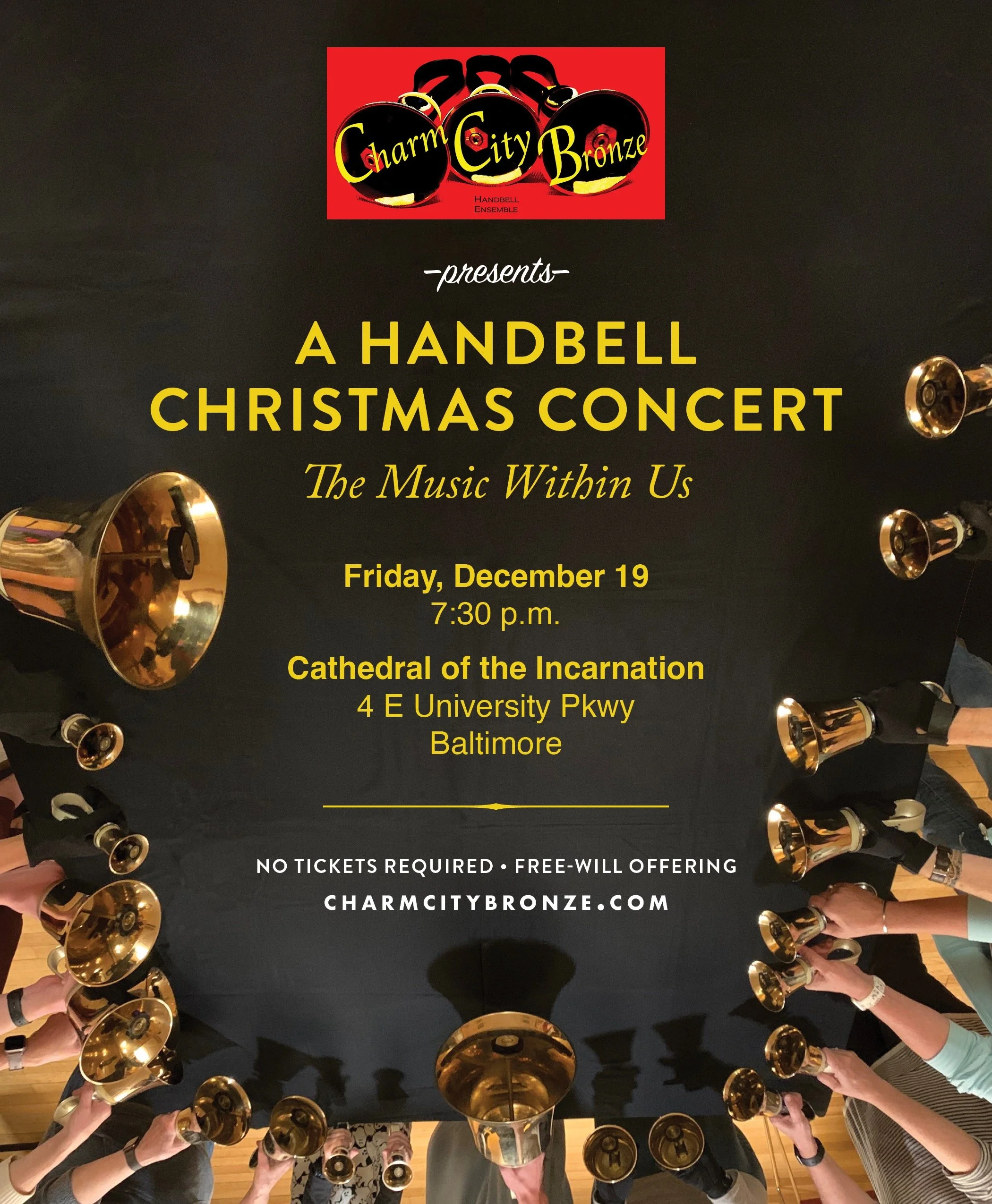 All are invited to Charm City Bronze’s Handbell Christmas Concert on Friday, December 17th at 7:30pm at Cathedral of the Incarnation in Baltimore. Concert features Christmas carols, ancient and modern, with over 5 octaves of handbells, organ, piano, trumpet & percussion. $10 Suggested donation — Masks required.